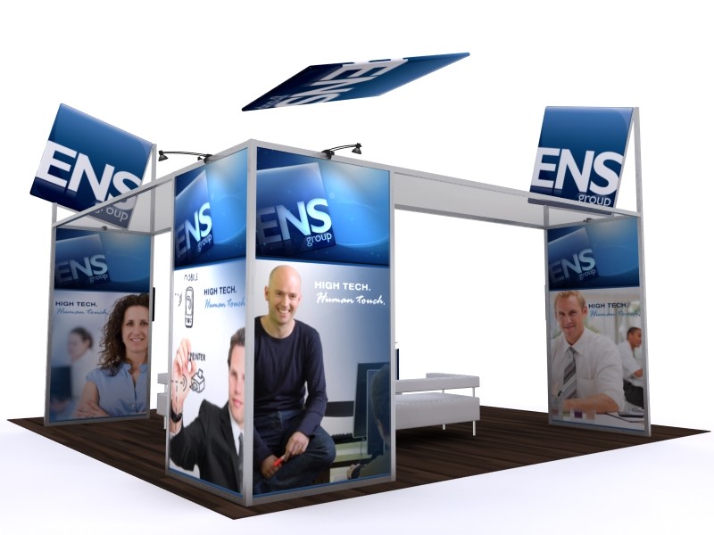 The 20 x 20 Custom Modular Exhibit 10.12 is an open and inviting booth layout. This 20ft exhibit features a tension fabric shape hanging sign, large format tension fabric graphics, aluminum modular hardware, two backwall counters with storage and shelf, reception counter with storage, two medium monitor mounts, and eight halogen lights. This exhibit can also reconfigure down to a 10′ x 20′ display and 10′ x 10′ display.