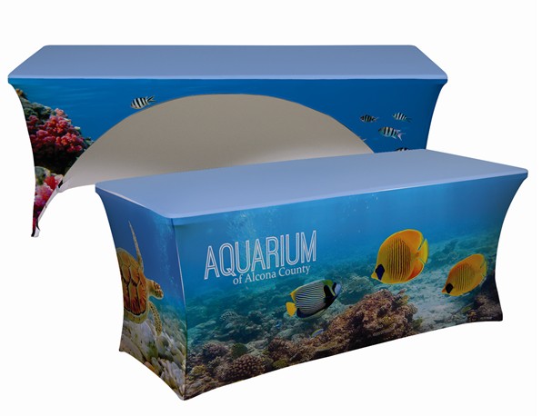 6′ Custom Stretch Fit Table Covers will add trendy stylish branding to your trade show display, presentation table or outdoor signage event. Our flexible fitted stretch table cover fits seamless and snug just like a tailored suit! This premium trade show accessory includes our HD dye sublimation full color printing process, that allows 100% PMS or CMYK color matching. Stretch fabric wrinkle resistant table covers can modernize any table top display and create additional branding space that’s visible from all display booth angles. Just like stretch fit active wear clothing, stretch table covers are machine washable and flame retardant.