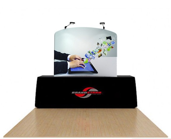 The 6ft Waveline Table Top Display features quick, easy setup with vibrant, large-format dye sublimation graphics. The aluminum tube frame is labeled and snaps together for fast, hassle free assembly. The full color, dye-sublimated graphic mural is printed on one side of the wrinkle resistant fabric, and the pillow case style graphic mural slips easily over the aluminum frame and zipping along the bottom of the 6ft display frame. You also have the option to upgrade by adding a convertable hard shipping case with graphic wrap. Additional upgrade options include added a table throw to complete your booth space along with halogen lights.