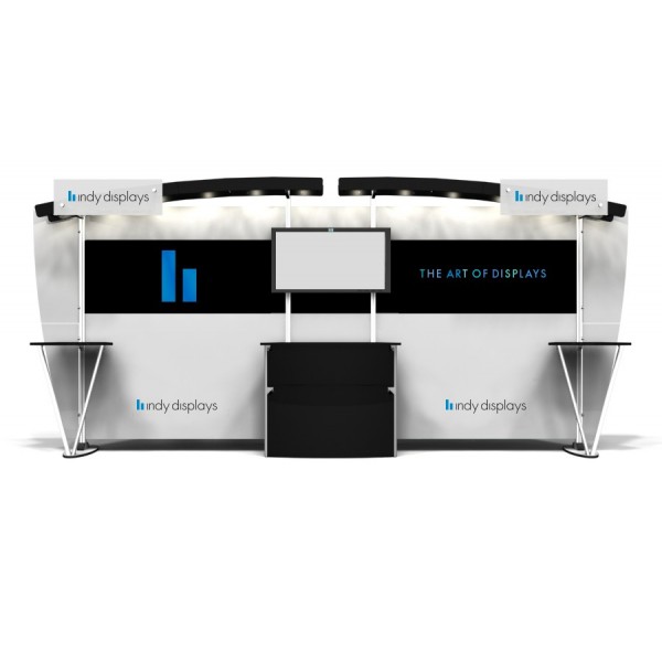 The structure of this 10×20 trade show display is made from durable and lightweight aluminum extrusions. The structure of the Exhibit Line system gives your company a clean, modern look. The exb.1020.2 display kit includes 2 curved laminate canopies that hold 6 halogen lights each and also includes 2 V-leg counters for product placement and center kiosk with attached enclosed counter. The entire trade show booth can be packaged into three 48.25T shipping cases (47″ x 23.5″ x 7″). Total weight of the exhibit booth is 189 lbs.