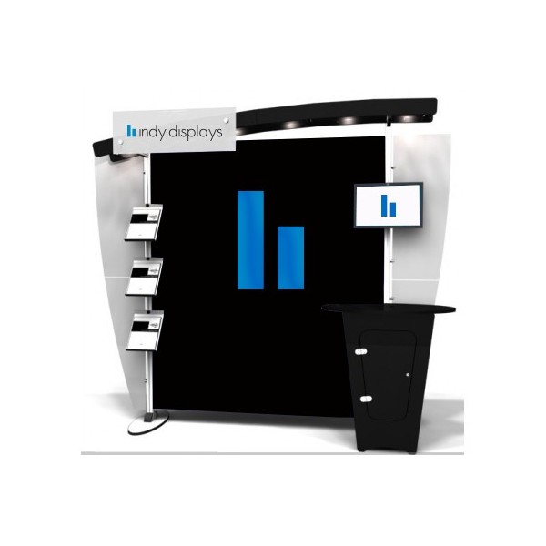 The EXB.NLC 10ft display kit includes a durable tapered counter with locking storage and laminated coutertop. The added benefit of secure storage allows your team to confidently leave company or personal items at the booth throughout the day or overnight. The monitor stand is attached to the display and holds monitors up to 36 inches. The slim literature stand provides an area to display a variety of printed marketing materials without crowding a 10′ x 10′ exhibit floor space.