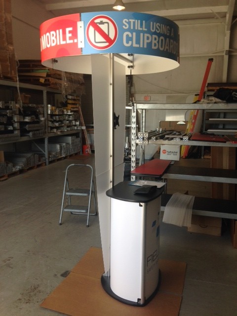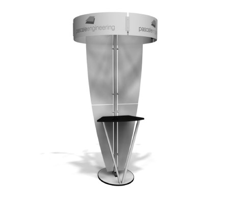 The structure of the portable kiosk is made from custom modular aluminum extrusions. The Exhibit Line K4.1.V Kiosk features a halo header panels, and frosted plex wings.