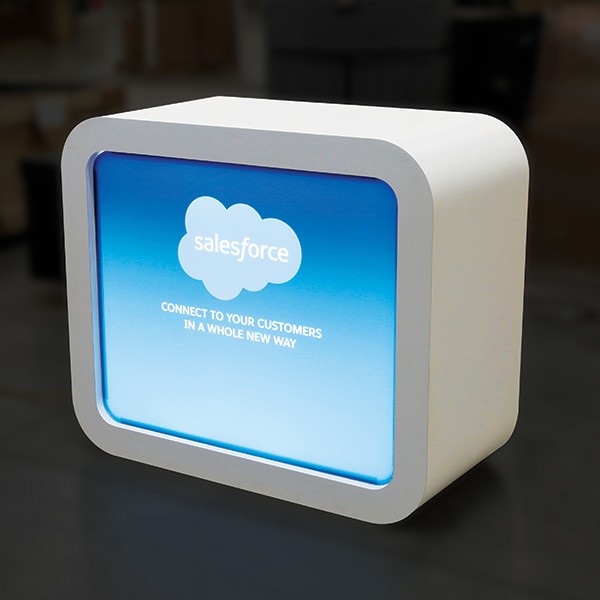 Modular Lightbox Hybrid Counter B is a premium custom backlit branded locking trade show cabinet, that’s often used in combination with LED lightbox back wall displays. Hybrid Counter B features a heavy-duty rounded edge laminate trade show cabinet frame with internal modular aluminum hardware. Additional hybrid features a backside laminate locking door that provides secure storage and internal display lights that illuminate the front SEG fabric graphic mural. This hybrid trade show cabinet will securely hold up to 65 lbs of countertop weight.