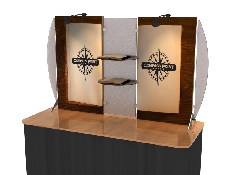 Segue Custom Modular Table Top Display VK-1852 is a modern display design featuring tension fabric graphics, lightweight aluminum frame, and two acrylic shelves. A silicone edge is attached to the tension fabric graphic that will guarantee a beautiful and wrinkle-free appearance. The Segue table top displays can be setup by one person in 20 minutes or less and packs neatly in its own portable fabric case with wheels. Sacagawea and Segue Table Top Displays are ideal for recruitment fairs, Chamber of Commerce shows, college events, and business expos.