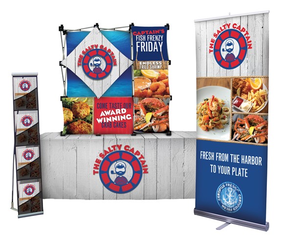 This portable table top display package features a unique look with ultra portability. The pop up display features three demensional graphic panels that are easy to change out if you have multiple products to display or just a different messages between trade shows. The versatile convertible 8′ table cover fits both 6′ and 8′ tables and includes a full dye sublimation graphic print over the entire throw.
